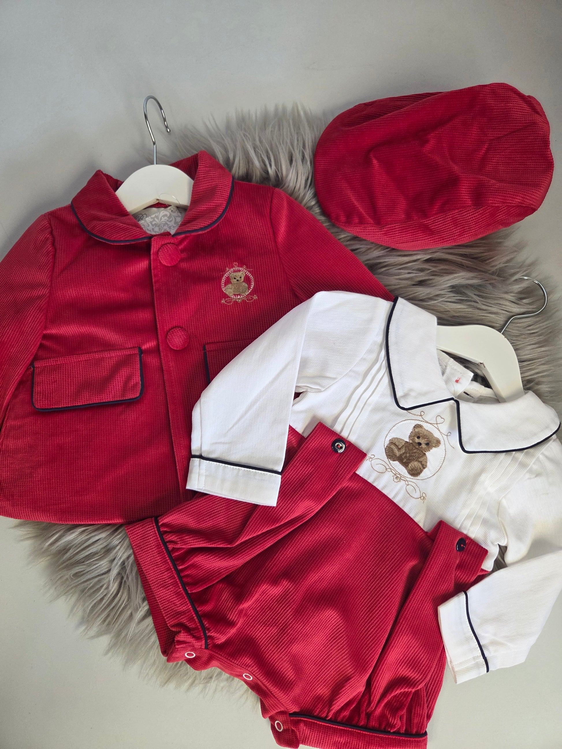 Boys Red Romper, Jacket & Hat Set! This set features a charming teddy bear motif that will make your little one stand out in style. Keep your child warm and adorable with this cute and comfortable set.