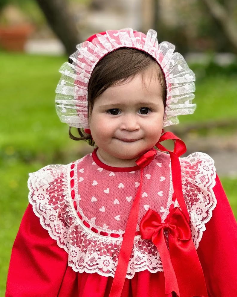 This handmade Girls Noelia Red Dress is perfect for any special occasion. With a delicate lace collar and a charming puffball silhouette, your little one will look elegant and stylish. Made to order for the perfect fit. Comes with knickers and bonnet