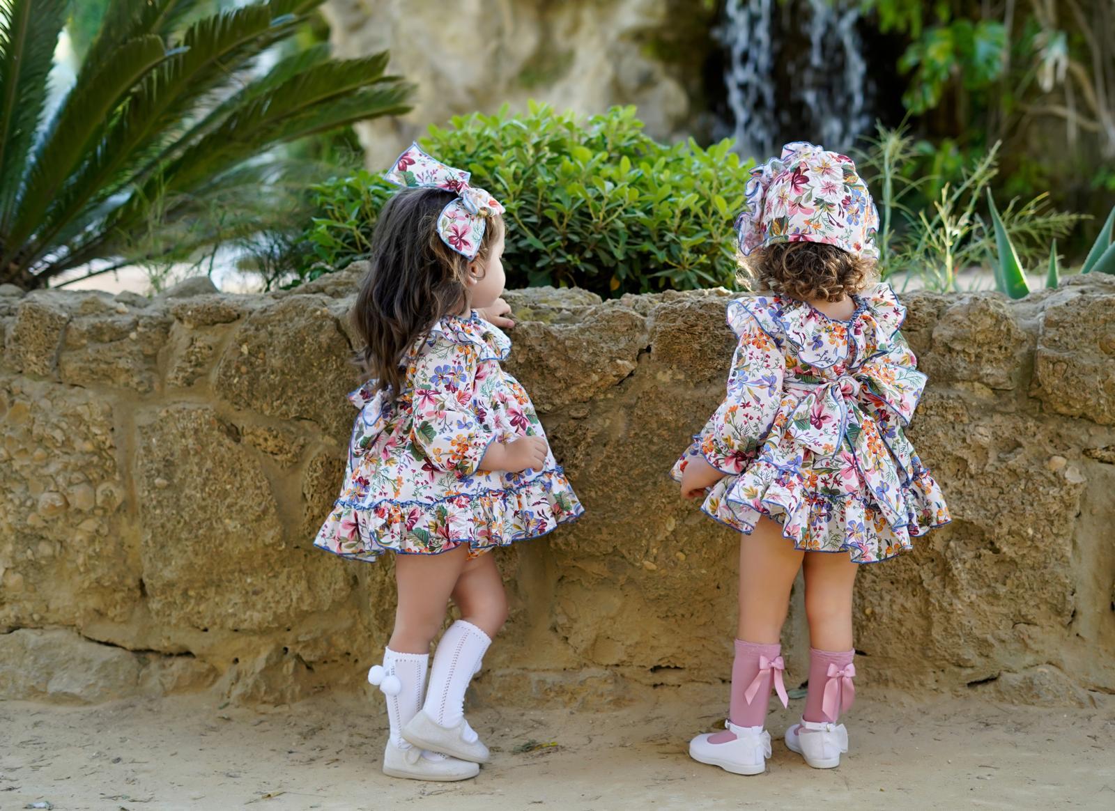 Ela AW24 'Betsy' Dress Set: Exquisite floral dress designed with a delicate frilly collar and a statement bow on the back. Made by the expert designers at Ela, this dress will make any occasion special. Preorder now.