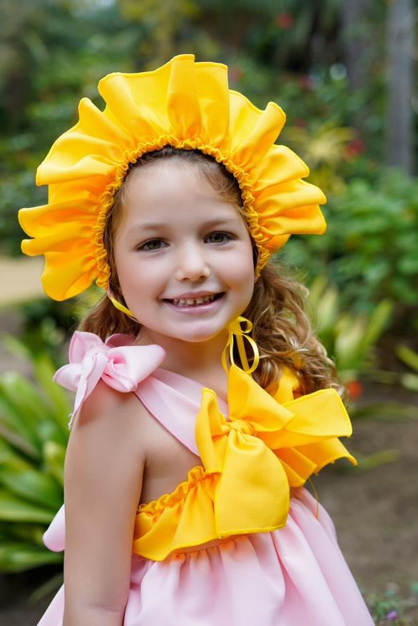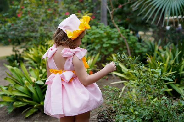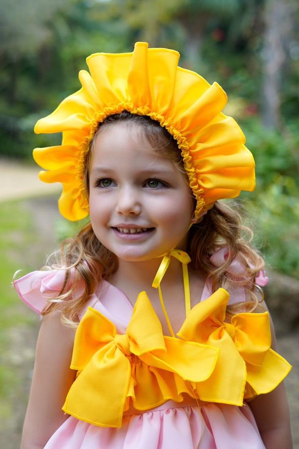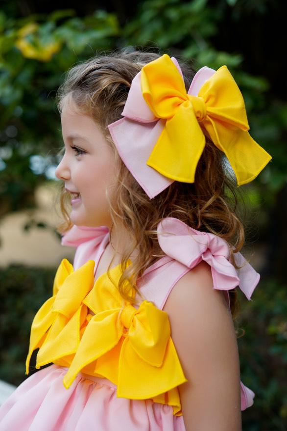 Introducing the Ela Confeccion Maisy Dress Set - a handmade creation from their new summer collection. The pink dress is adorned with charming yellow bows, and comes with knickers and a bonnet (fitting ages 6 months to 3 years) and hair bow clip (ages 4 to 8 years). Perfect for your little fashionista.