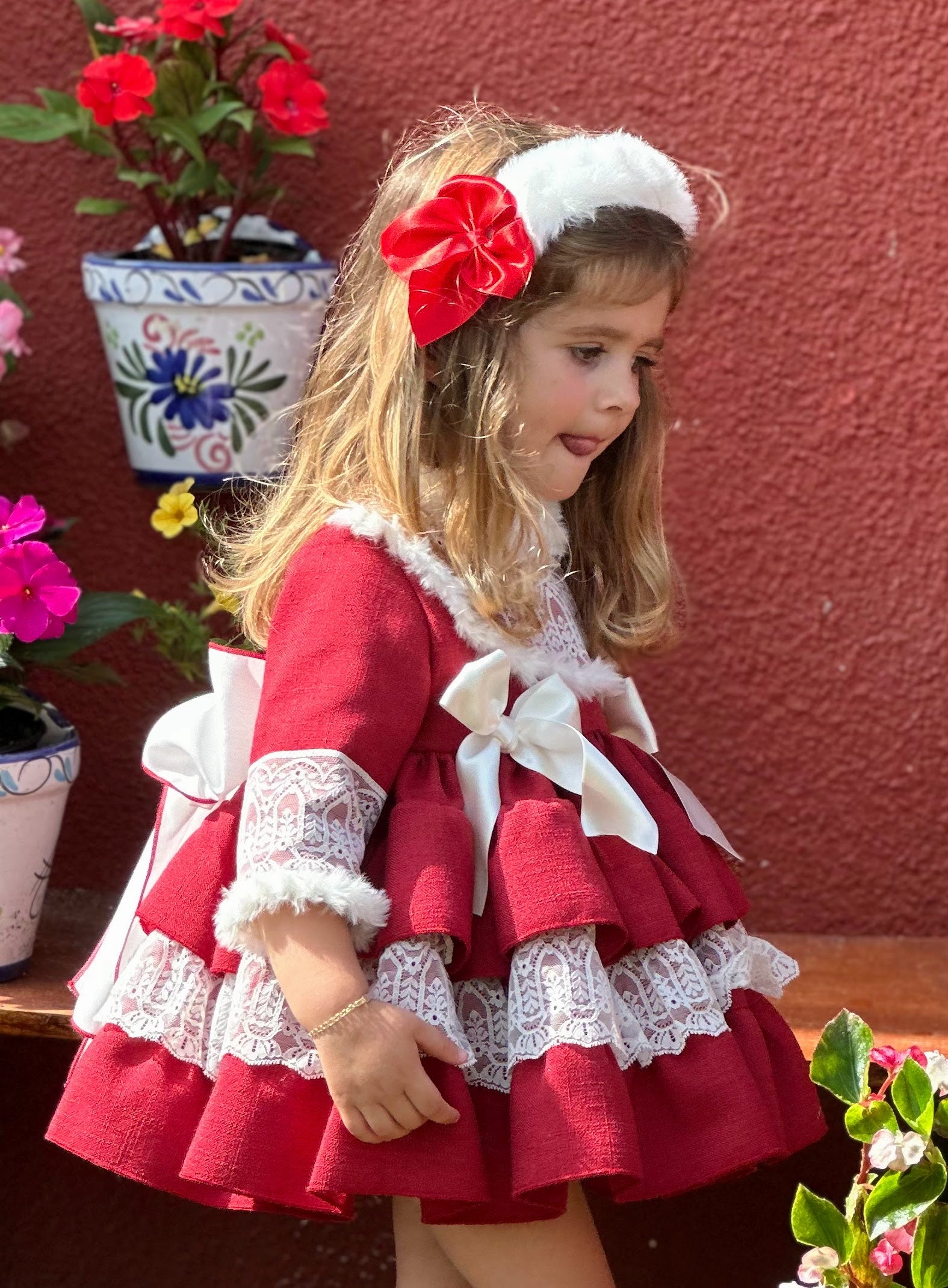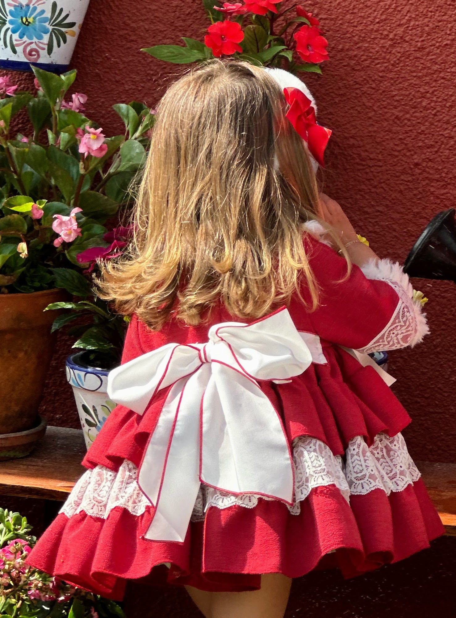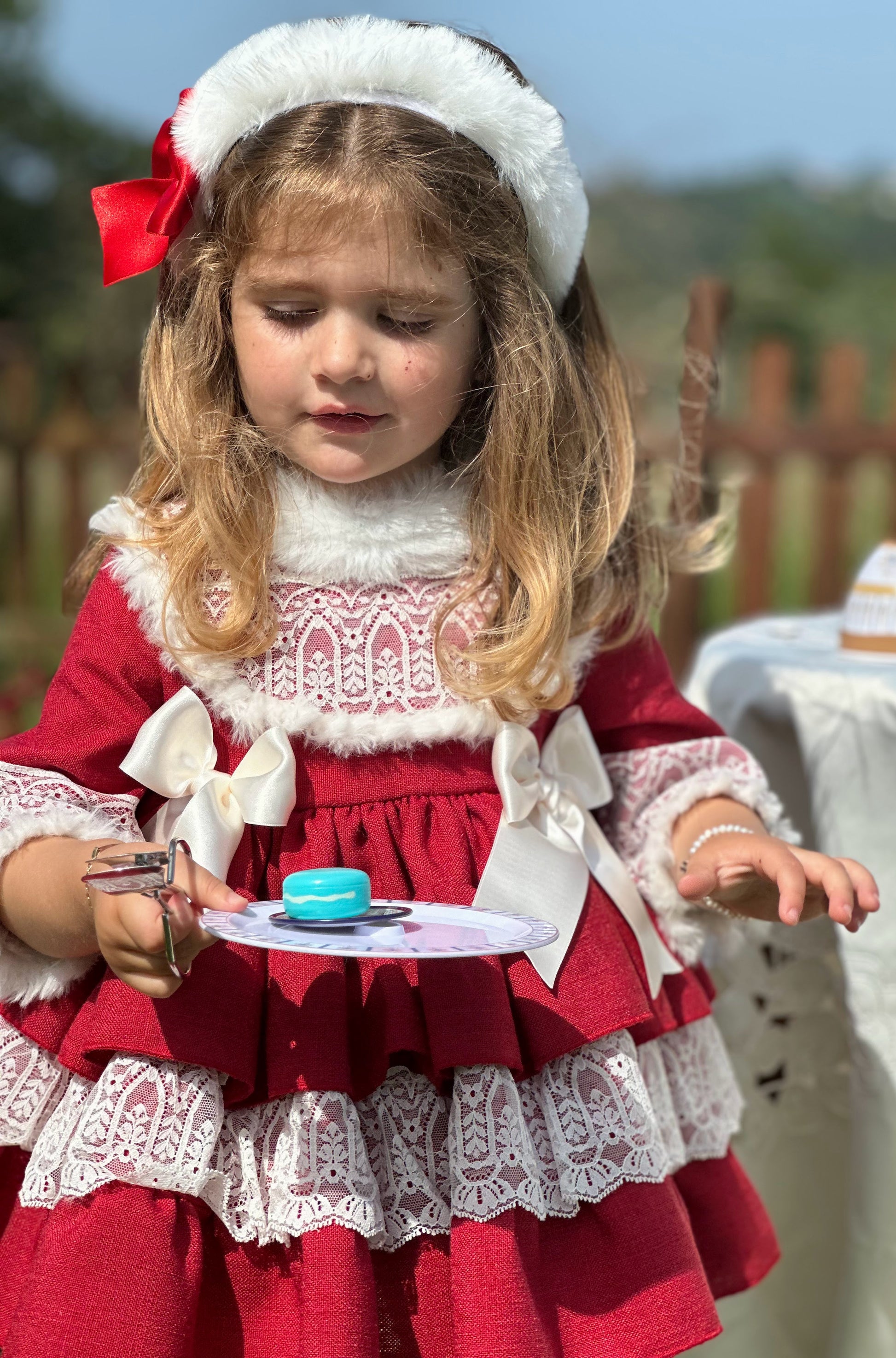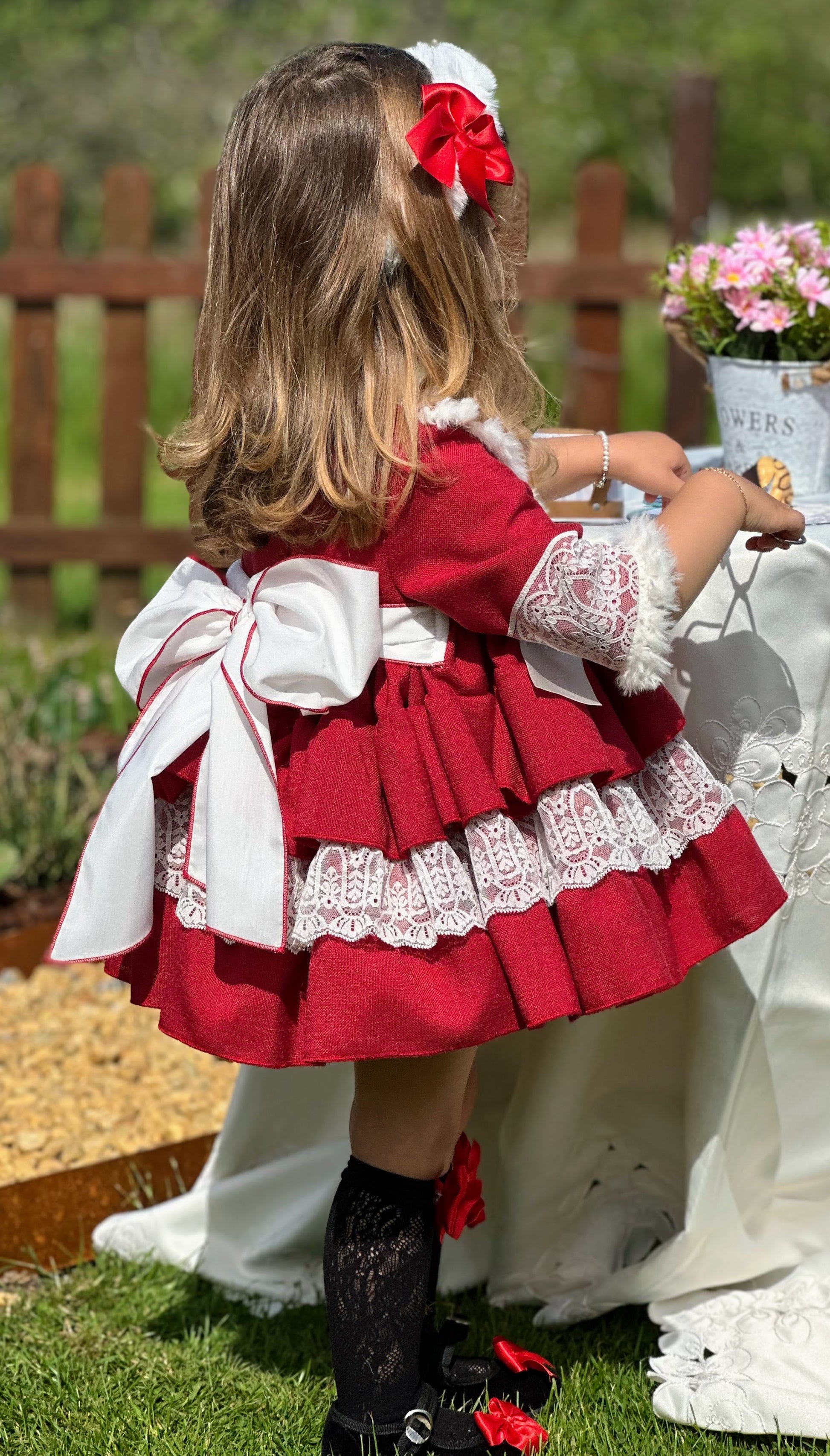 This Girls White Lace & Red Fur Dress is handmade by Sonata Infantil AW25. The dress features a charming red ruffle design with delicate white lace detailing and bows. Made to order, this dress is perfect for any special occasion and will make your little girl feel like a princess