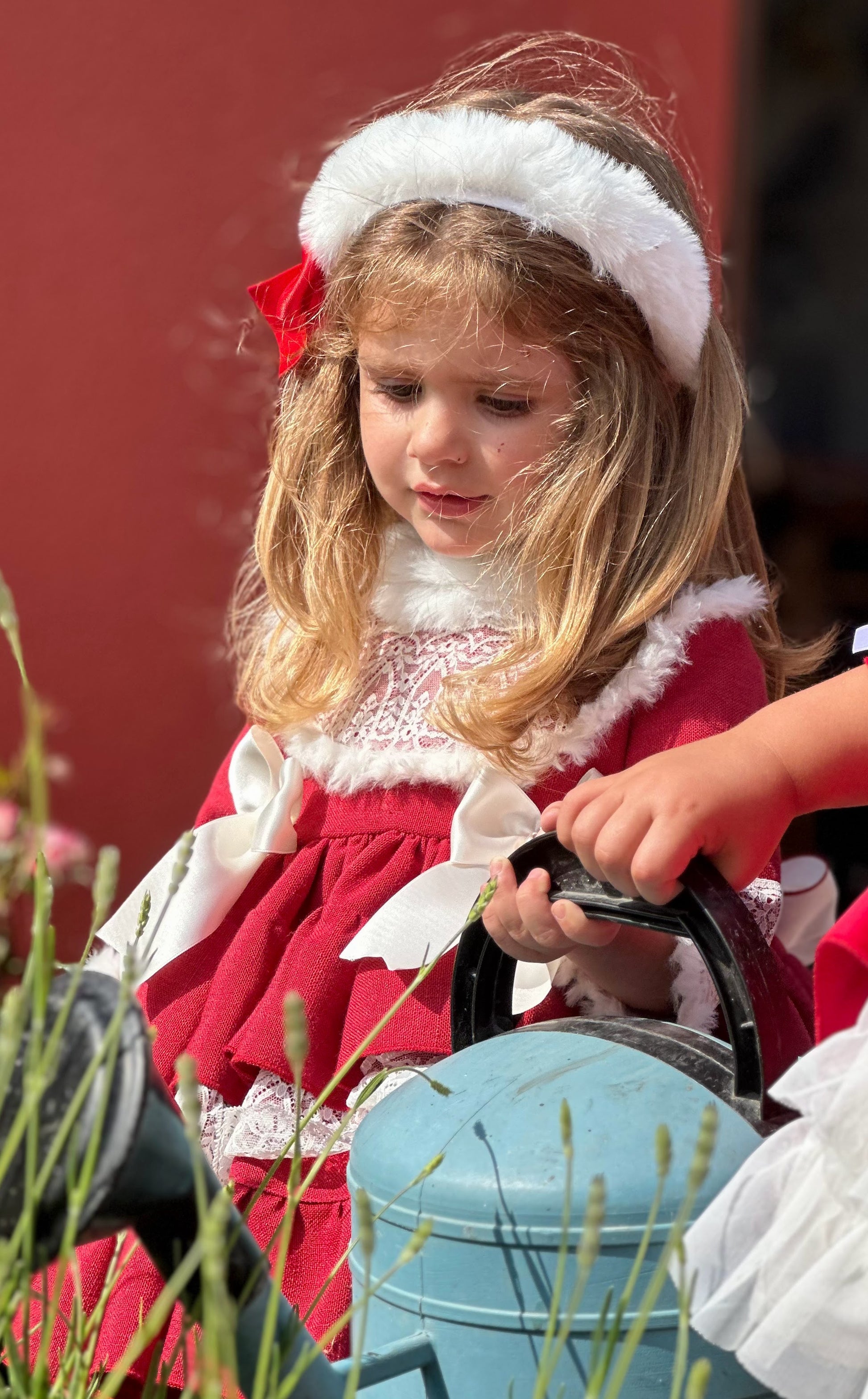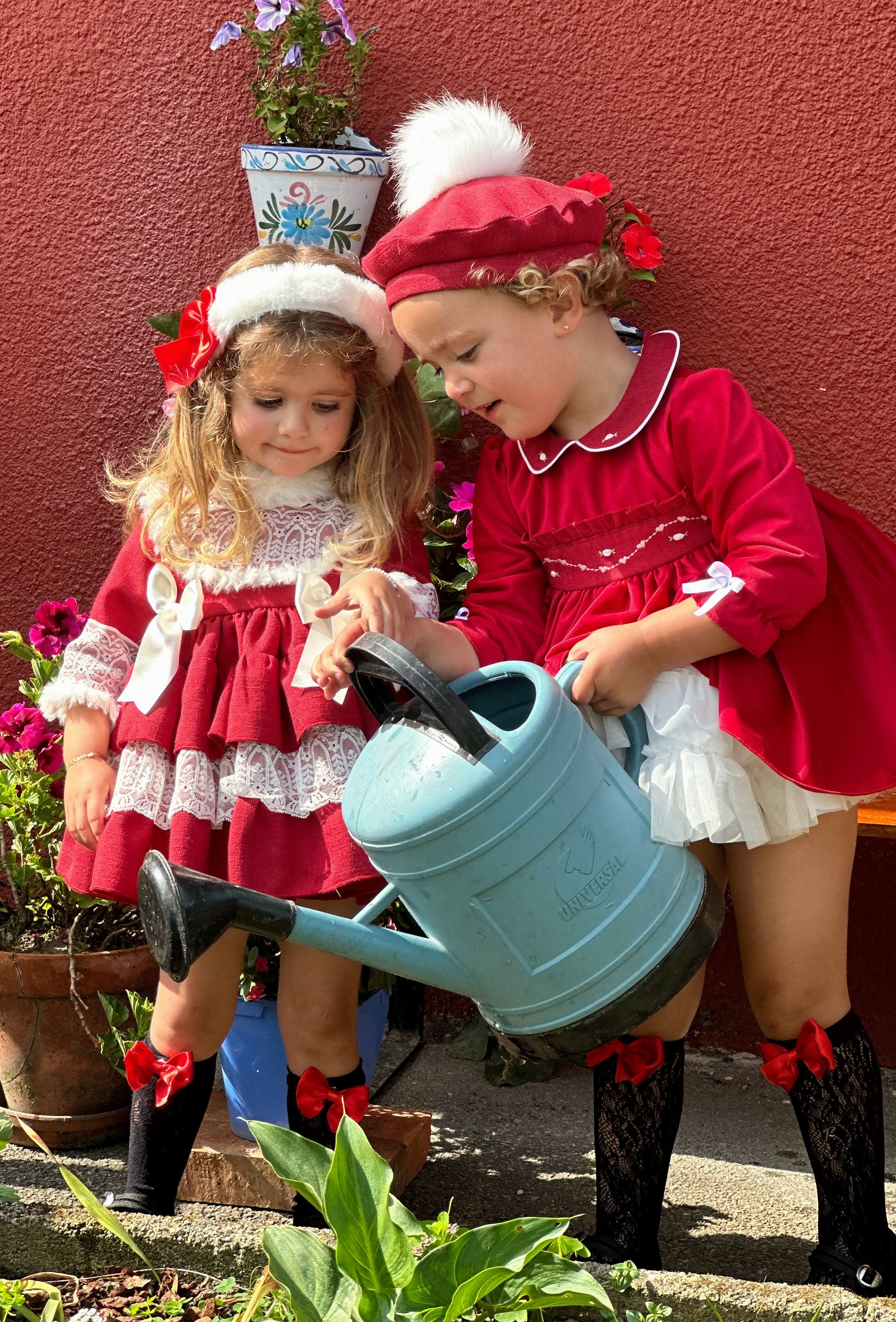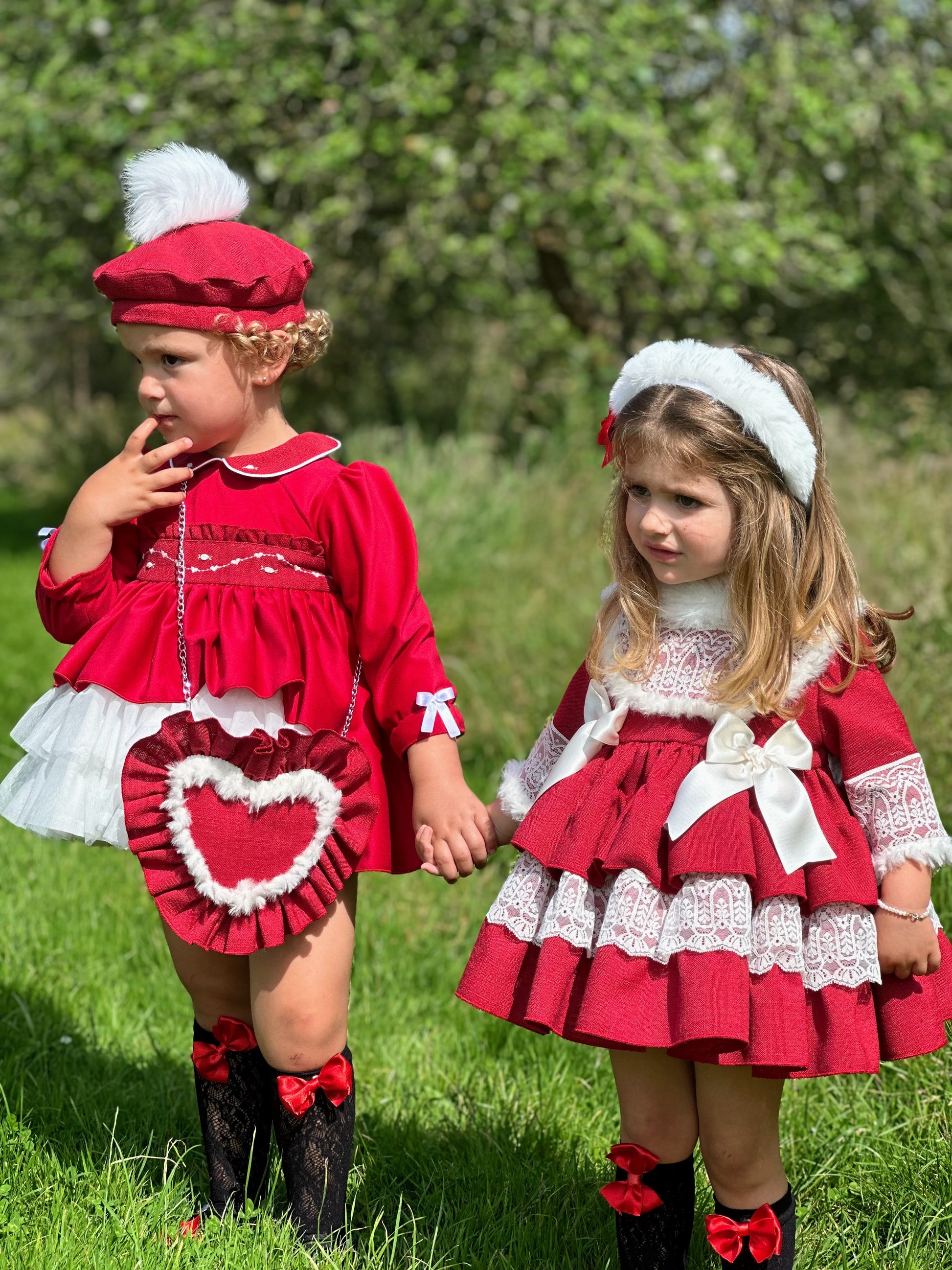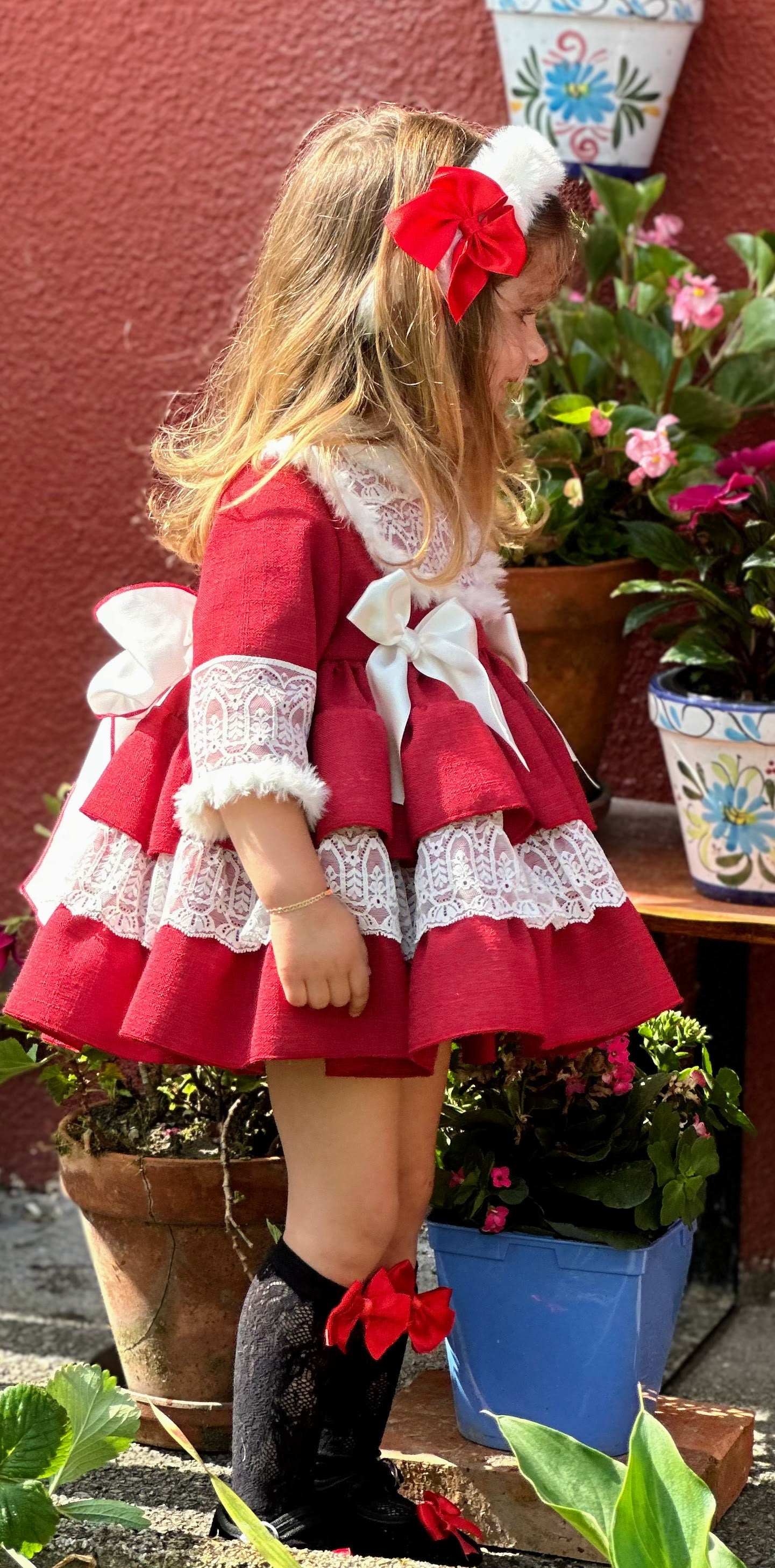 This Girls White Lace & Red Fur Dress is handmade by Sonata Infantil AW25. The dress features a charming red ruffle design with delicate white lace detailing and bows. Made to order, this dress is perfect for any special occasion and will make your little girl feel like a princess