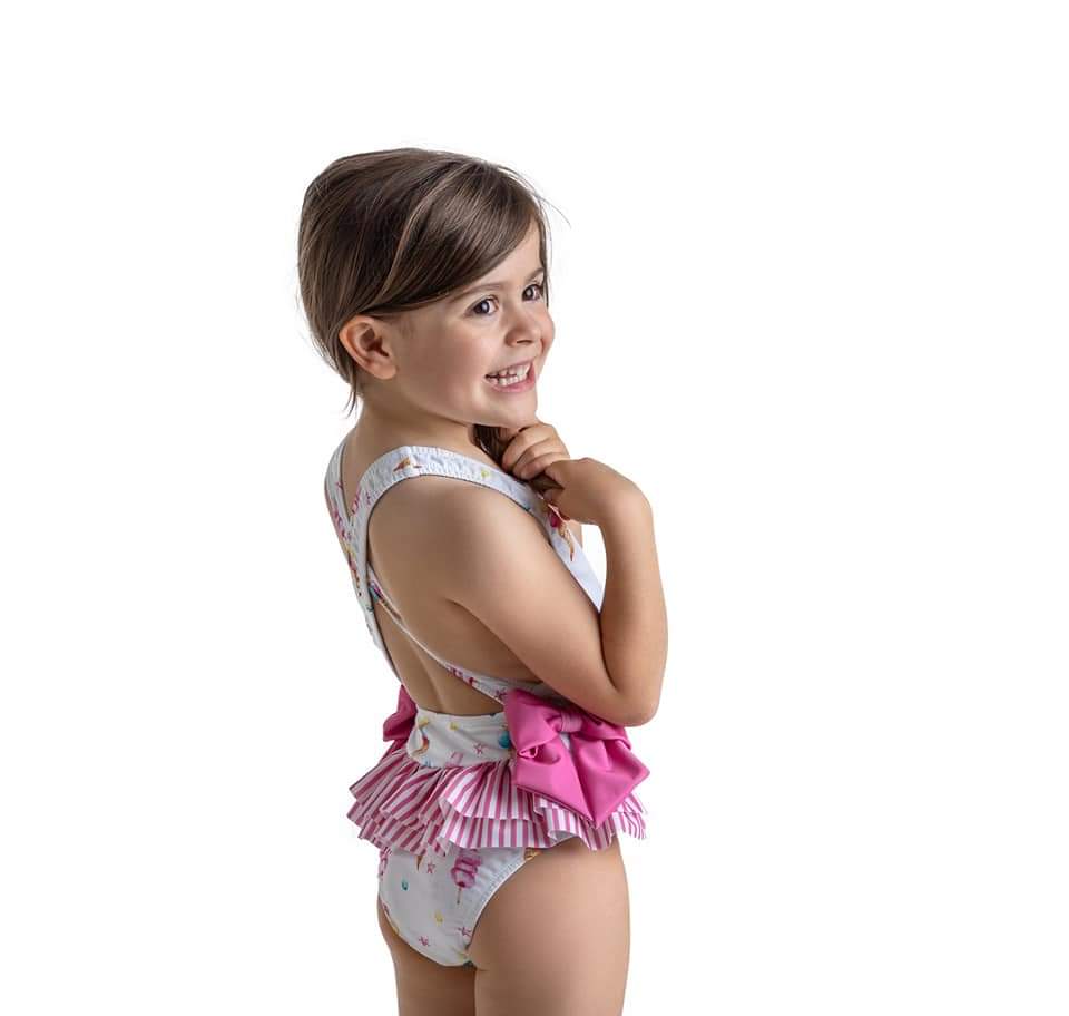 Update your wardrobe with this stunning ice cream swimming costume made by Meia Pata. Beautiful girls swimsuit that will brighten up trips to the beach and holidays. Made with a light material for comfy splashing with a cross over back. Frills added for a beautiful touch