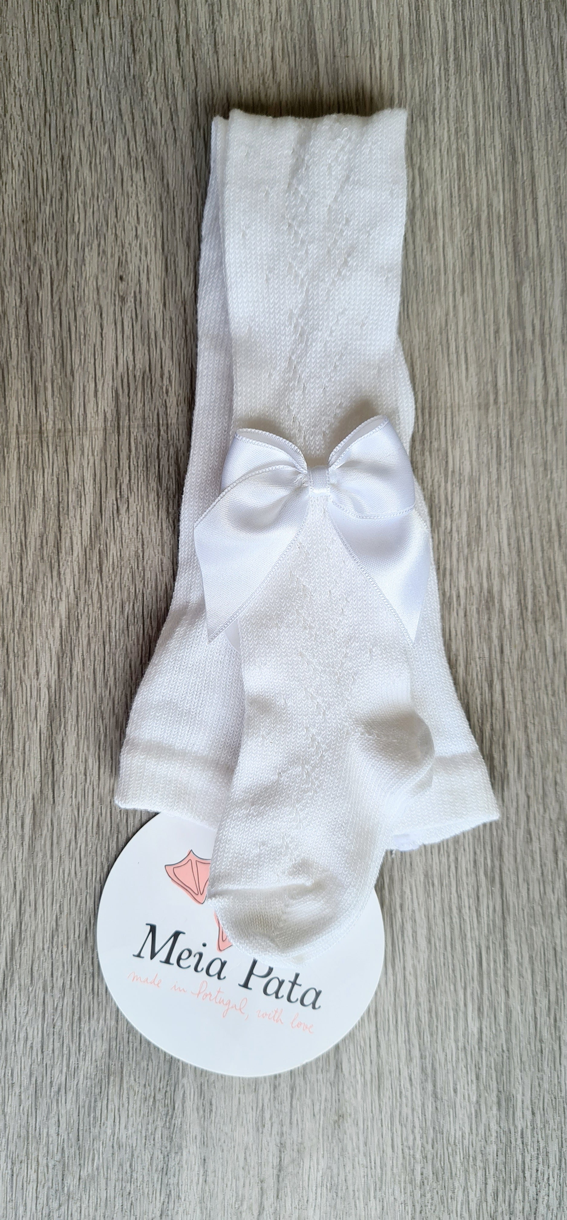 Upgrade your little girl's wardrobe with these luxurious Meia Pata Bow Tights. Crafted with open weave fabric, these tights feature delicate bows on each side for an elegant touch. Perfect for any occasion, these tights will take her outfits to the next level.