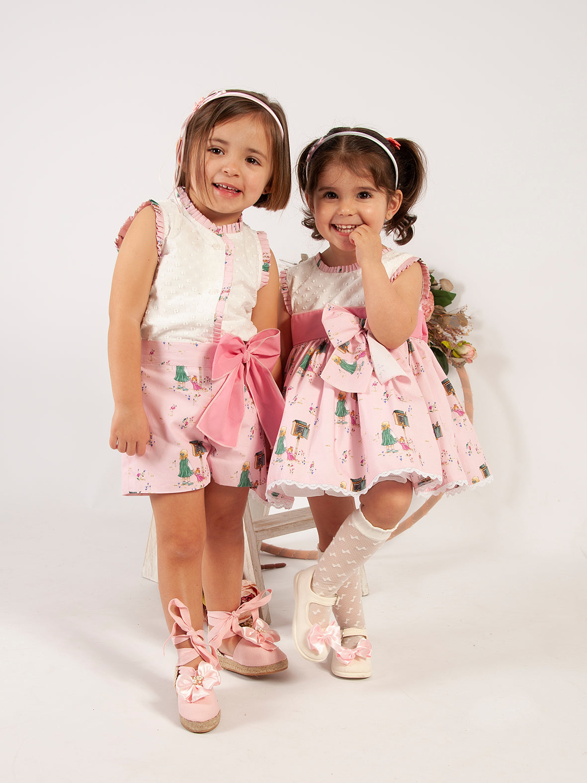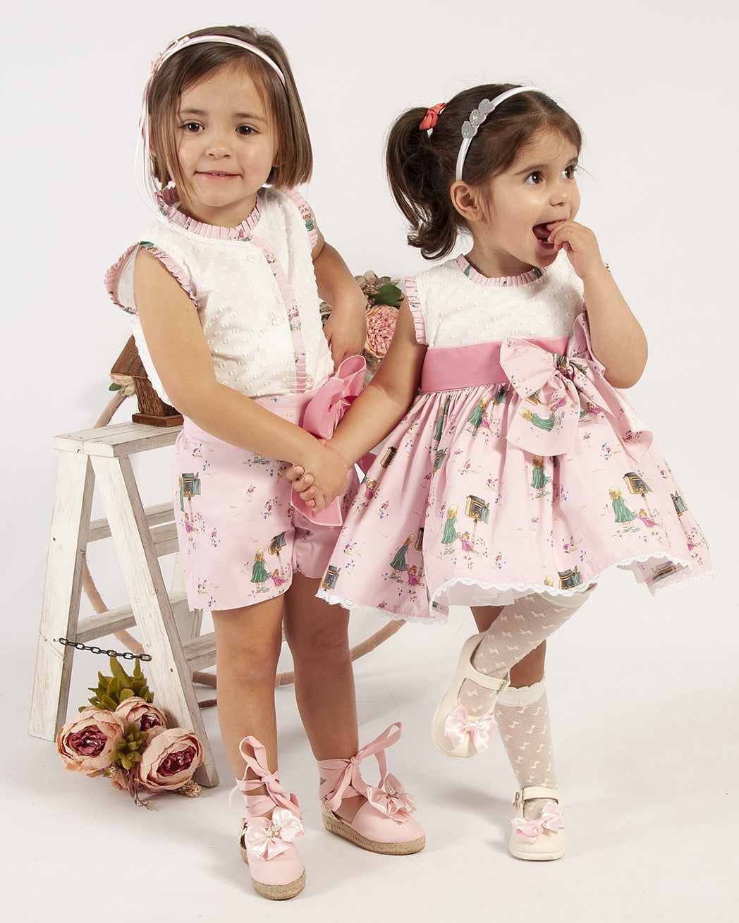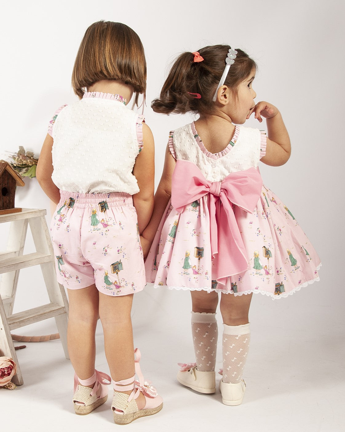 Expertly crafted by Sonata in Spain, this Plumeti Blouse and Pink Printed Short Set is sure to make a statement. Made from high-quality plumeti material, the handmade shorts features a large bow and is perfectly paired with the matching swiss dot blouse, which are finished with a delicate pink fabric trim. Elevate your style with this unique and chic set.