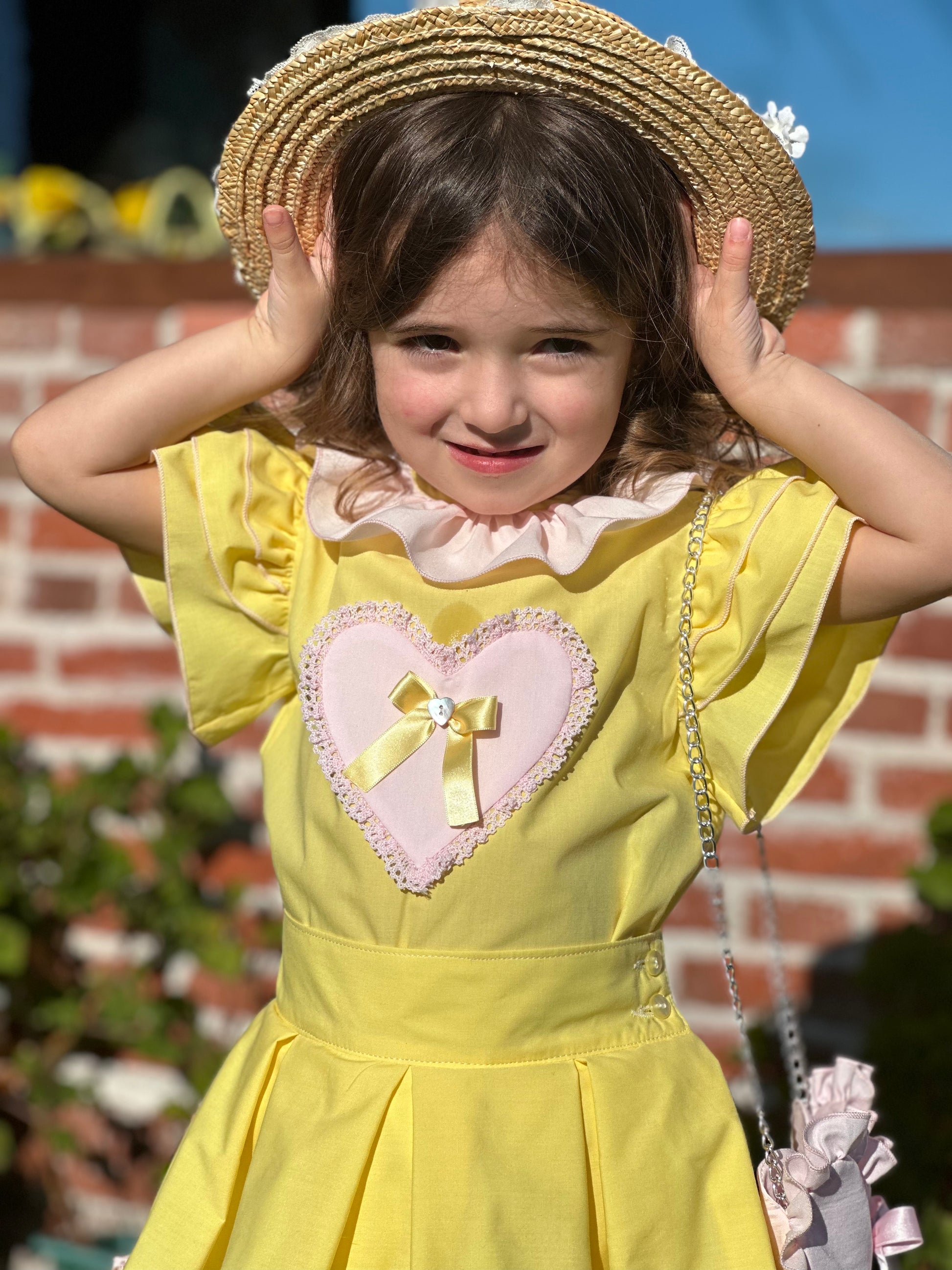Dress your little one in this beautiful handmade Spanish blouse and skirt set from Sonata Infantil! Featuring a lovely heart embellishment with a cute bow, this set is perfect for any occasion. Available in a variety of color combinations upon request. Get yours now and make your girl shine!