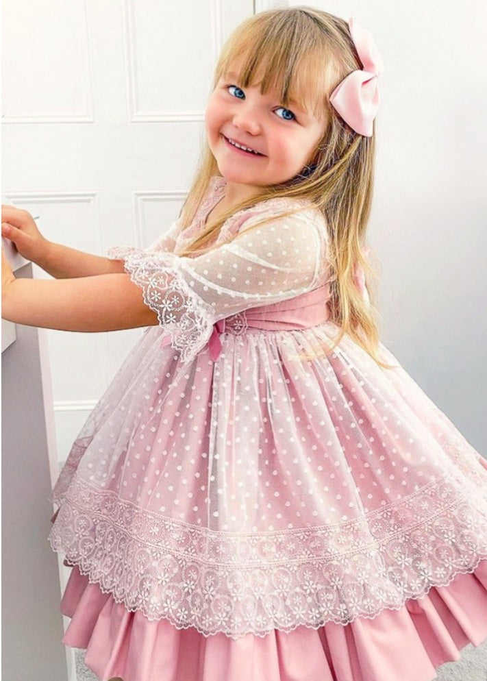 Expertly crafted in Spain, our Girls Pink Puffball Dress is the perfect balance of elegance and playfulness. Made to order with beautiful lace and a tulle overlay, it will make your little girl feel like a princess while providing comfort and style. Available in a range of sizes.
