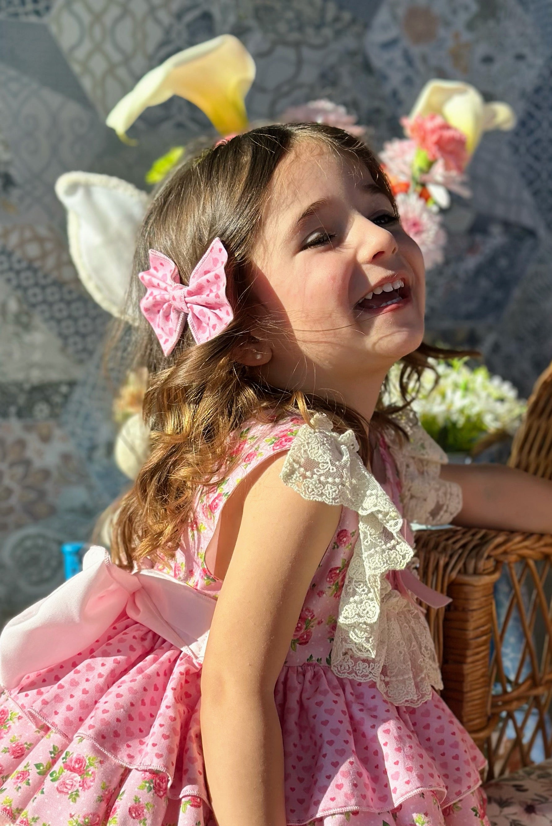 Sonata Infantil Summer 2025. This breathtaking Sonata dress is crafted with love, featuring delicate lace and adorned with heart and rose floral fabrics. Each layered ruffle adds to its one-of-a-kind charm, making it a perfect choice for any occasions. Comes with matching hair bow. Your little girl will feel like a true princess in this stunning dress.